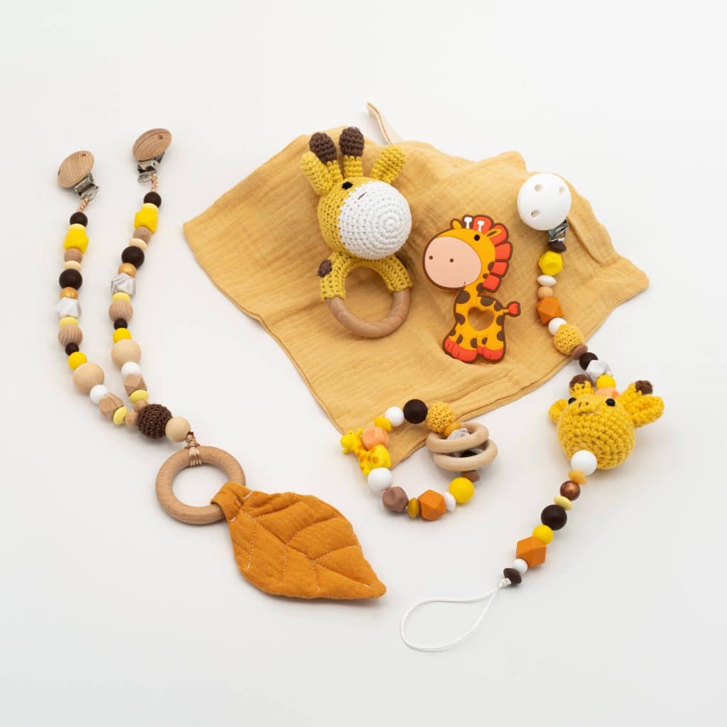 מארז שכולו ג'ירפה שאי אפשר להוריד ממנה את העיניים! המארז כולל: שרוך למוצץ בגווני חום, צהוב וכתום עם ג'ירפה סרוגה. נשכן חרוזים באותם הגוונים, עם דמות ג'ירפה מעץ וחרוז סיליקון של ג'ירפה. מובייל לעגלה/ לסל קל- באותם הגוונים. נשכן סיליקון ג'ירפה. חיתול בד קטן בצבע צהבהב. רעשן ג'ירפה סרוג- במתנה!
