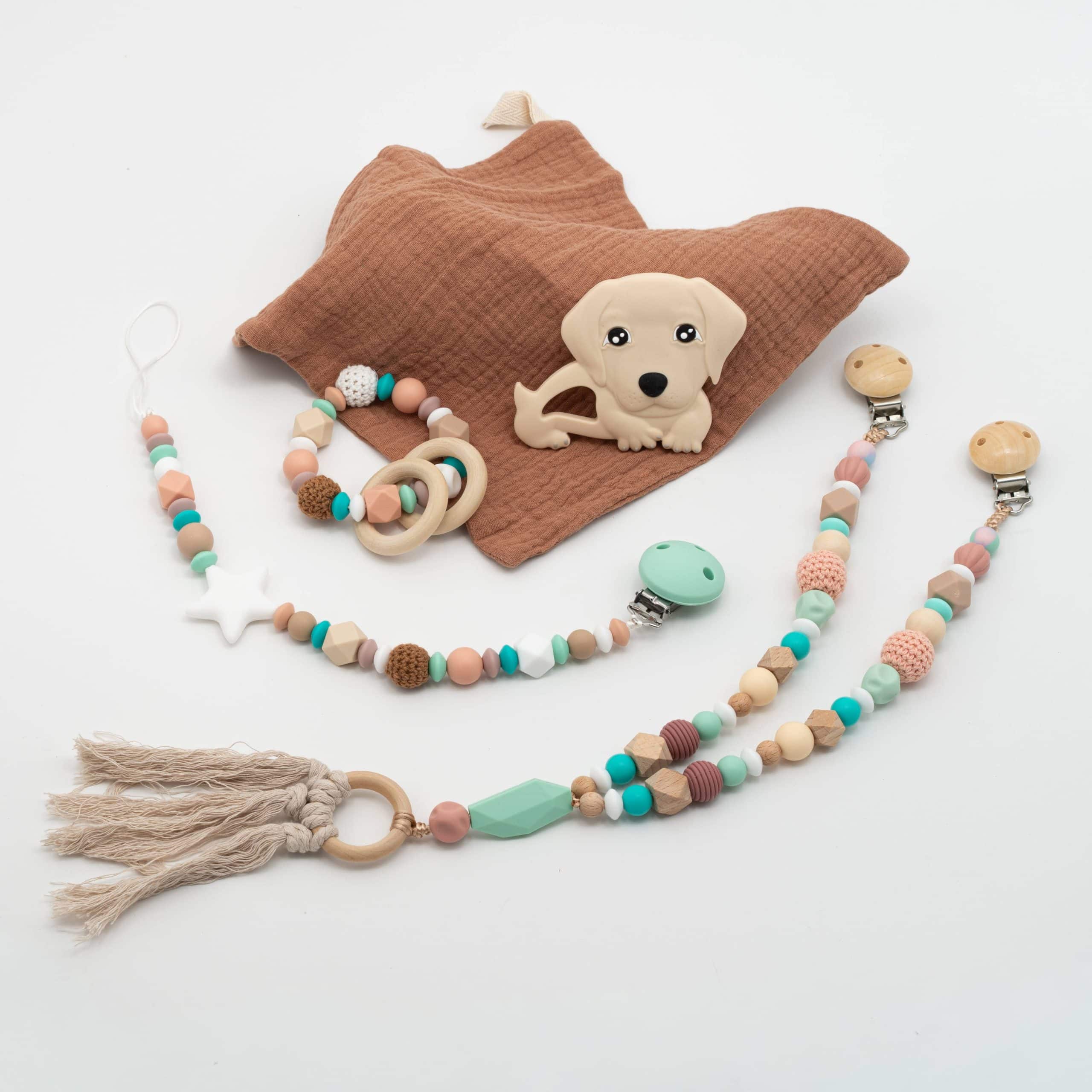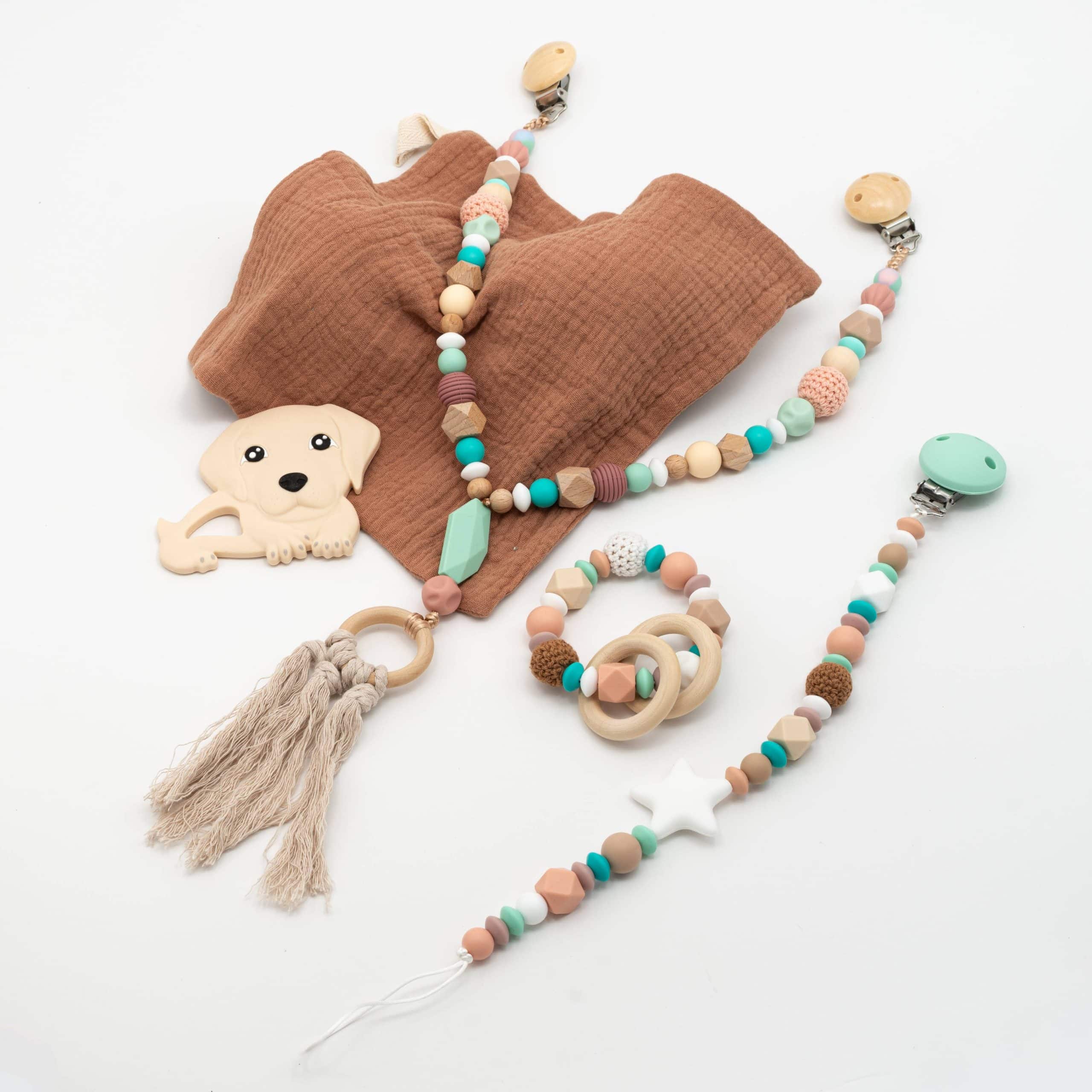 מארז לאוהבי הכלבים! המארז כולל: שרוך למוצץ בגווני טורקיז, אפרסק, מנטה, בז' ולבן. מגיע עם נשכן סיליקון תואם בצורת כלבלב בז'. מובייל לעגלה/ לסלקל בגווני טורקיז, אפרסק, מנטה, בז' ולבן. חיתול בד קטן בצבע חום. נשכן חרוזים באותם הגוונים- מתנה!