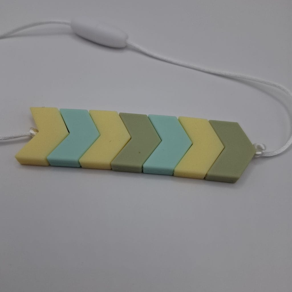 צמיד הנקה שיקי, עשוי מחרוזי סיליקון צבעוניים, בצבעי: צהוב, ירוק זית ומנטה. מושחלים על חוט לבן. משמש כנשכן לתינוקך וגם כתכשיט עבורך כאמא.